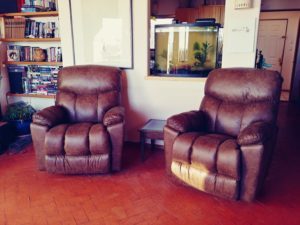 It’s funny because, when I saw Megan Mulry Monday night (we saw The Favourite and had dinner after – if you want to hear my thoughts on the movie, you can listen here), I showed her the pics of the rearrangement. She’s house-sat for us before, so she was familiar with the previous set up. She agreed the recliners were a great idea – so much easier to swivel to watch movies, so comfy! – and then asked what I’d do about the fact that I have two other armchairs on the other side of the room. I started laughing and said, “Nothing! I’m leaving it as is, but my mother said the SAME THING.” So Megan starts laughing, too, saying “Omigod, me and your mom.” (Who she’s met and they enjoy each other.) And I said, “Yeah, my mom said, ‘but you can’t have chair, chair, chair, chair.'” Megan is still snorting into her beer, and says, “I know – like a meeting!”