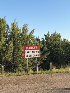 These signs always amuse me so much. Although, in New Mexico, the lakes are often somewhat hidden from view, and one can come upon them precipitously, from flat mesa to deep canyon filled with water. Still… the warning signs make me smile.