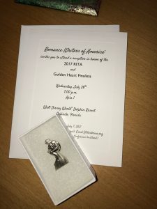 Really lovely how RWA sends the RITA and Golden Heart Finalists this invitation to the reception, along with our shiny finalist pin! Both are mementos to treasure.