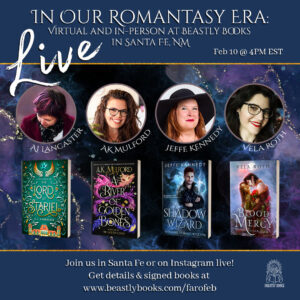 Join me next Saturday, Feb 10th, 4:00 – 5:30 PM ET/2:00 – 3:30 PM MT for a super fun panel: “In Our Romantasy Era” – how and why romantasy stories are resonating with readers and authors today. The event will take place in person at Beastly Books in Santa Fe, NM and online on Instagram live @farofeb and @beastlybooks418. Should be a great conversation!
