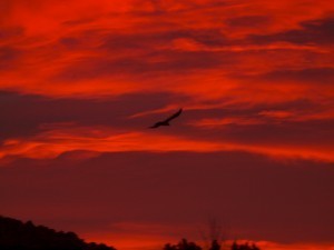 There’s an element of serendipity to so much in life. Like getting a cool photograph – it’s not really something you can plan for. This morning’s sunrise bloomed with exceptionally intense reds, oranges and pinks. But I don’t always go out to snap pics. This morning, though, David needed to charge his MP3 player before we went to the gym, so I had some time to kill. Then I saw a crow sitting in the big cottonwood by our neighbor’s house, thought of Laura Bickle and her crows, and decided to go back in for my telephoto lens. The bird then obliged by winging through the molten sky for me. I got six or seven great pics – most of which you’ll undoubtedly get to see here over the next couple of weeks.