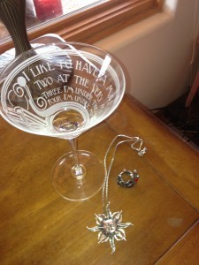 Some of the birthday sussies from my writing gals. Allison Pang sent the fab martini glass. It’s a quote from Dorothy Parker: “I like to have a martini, Two at the most. Three, I’m under the table. Four, I’m under my host.” Apropos in so many ways! Marcella sent the dramatic Mardis Gras ring, which embodies Ruby. And Laura Bickle sent the gorgeous sun pendant, which has a special meaning, celebrating this summer.