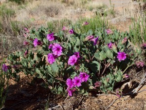 The desert four o’clocks bloom in these random patches, spots of brilliant color I come on unexpectedly while walking. Better than a Cracker-Jack prize.