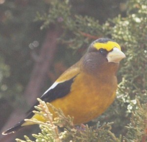 A flock of evening grosbeaks came through and hit our feeder hard for a couple of hours at the beginning of March. (Sorry – it's been a busy month.) They descended like a brilliant yellow cloud, here and gone again, the proverbial ray of sunshine.