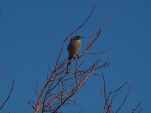 We're pretty sure this is a Western scrub jay. He likes to hang out in the tree in our back yard. Apparently he likes to eat small animals and large insects. Check out these wicked talons:
