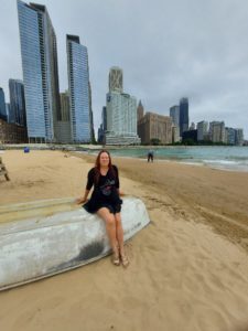 A beach one of my friends – Alex, a different Alex – had found this beach and so we went down on Sunday morning and went swimming and that was really great. Ah it was um. Yeah, it’s so cool the way lake shore drive divides downtown from the lake and they had closed lake shore drive. It was Sunday morning of labor day weekend and there were all of these bicyclists going up and down lake shore drive. They’d closed it traffic and that was so neat to see. Um. And it was kind of a stormy morning but we had timed it well before it started to rain and so we went swimming and then I walked back in time to clean up and see ah it was funny because I know I have this phrase from my mother. But I I used it twice ah to different response I should tell the story in order. So I had said to to Kelly ah, when I met her very early for breakfast one morning. Ah like. Six forty five she picked me up at six forty five and we went to this place at 7 that opened at 7 which is the um only morning I didn’t walk because of that and but we both had stop later that morning so it was like you know go have breakfast and so we can get back and I said okay well I’m not going to be cute.