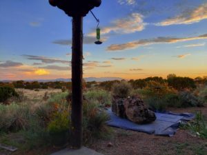 David’s pulling the car out I was like no, what’s happening so much activity today. So anyway, we were going to go do this tour of um, Georgia O’Keeffe’s winter home and studio in Abiquiu. And this would have been like my fourth time I love to take creative friends there and I recommend it if you’re in the Santa Fe region and you’re any type of creative. It’s so worth going because this is where she lived towards the end of her life and she set up this house. Exactly as she wanted it I want to say the latter half of her life. Um up until she had to move into. Um you know, kind of assisted living in Santa Fe when she was very old and declining last couple years. So. Because she was a visual artist. The house is set up with these beautiful windows that capture specific ah swatches of landscape. it’s um it’s like to me this is the pilgrimage. You know it’s like I could take her leave. The the chapel at Chimayo if um, you know I’ll take people to see that if they want to. You know you can go touch the holy dirt as it were um that has no mystical significance to me. Being in Georgia O’Keeffe’s home her studio. Her garden is um that for me is the mystical experience. It is I don’t know there is a there is a vibe to it. There is an energy in the air. There is a. Ah, purity to it that I find it immensely moving. So I’m disappointed that Kelly and Alyx won’t get to experience it. We also had a day passed to Ghost Ranch but that would have been just sort of knocking about and seeing some of the landscape we didn’t have like the the horseback ride or anything. So um, yeah, that’s too bad. It would have been a fun excursion I really wanted Kelly to see it but she woke up this morning. Saying that she’s sure she has strep throat I really suspect. It’s the the dryness of the climate here I could be wrong. It’ll be interesting to see but she went ahead and made an appointment with urgent care. For first thing this morning. So yeah, she um.