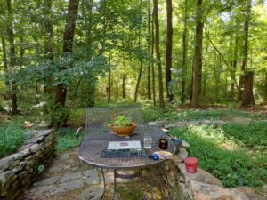 Airline travel shenanigans they are desperately trying to make back their money. Ah from pandemic. They don’t have enough people they’re charging extortionate prices and giving shitty service. So yay, but. And went on this writing retreat. Um I finally did find out for those of you who who listen regularly that um that the person hosting it preferred not to have their name connected to it yet because they’re still putting things together. This was um. Little bit of a test they’re considering hosting ongoing writing retreats and had invited me and a few other people to kind of come be the guinea pigs and see you kind of kick the tires that kind of thing. And to keep an eye on Jackson um, and you you guys it was. It was fabulous. It was so wonderful. Um, in fact, that reminds me I meant to they gave me an exit survey and I meant to reply and say um that I’m happy to give a testimonial anytime. Have to remember to do that fact, let me put that on my things to do list I hope you guys don’t mind – testimonial – otherwise I forget to do these things. Um. So oops so it was beautiful. A location I will post a picture of my writing spot. It was very different from my natural habitat in that it was um in a warm and humid place and was forestres. And I would sit and write at the verge of the forest in a they called it a pergola I always call this the grape arbor they call it but it was very much like this um only their vine was not growing. Um, and I’m not sure why it was kind of fascinating because this. Land has been within the same family for a really long time over 100 years and I could see evidences of previous gardeners. A lot of the garden had been neglected for a very long time. But. It was really cool to see where the garden had been and sort of identify with this person who had gone before and spent all this time putting things into place and I had a ah very strong desire to.