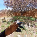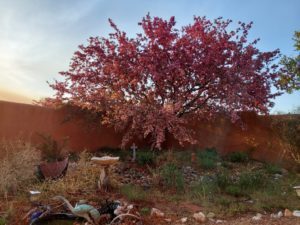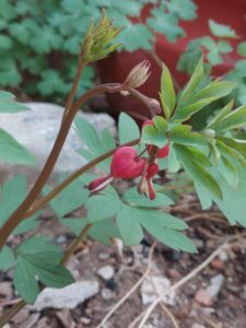 We put in ponds and waterfalls and my garden at 1 of them the first house with which had the great bleeding heart was actually on the town’s ah, garden tour one year which is not. Ah, fantastic accomplishment probably because um it was a small town but I was proud I was proud and and I put took flowers and plants to the garden show and won prizes so there you go my grandmother loved garden. And my mom says it skips a generation that’s her excuse. Although my mom loves to do potted plants and she’s amazing at design and I just splashed my coffee everywhere. That’s not good. It’s a Monday somebody has a kiss on the Mondays. So um, last fall I thought well oh I should this was the other bit of backstory is that when we moved to Santa Fe I thought oh it’s going to be so much easier to garden there because we always. Joked about gardening and laremie as being an exercise in building character because the environment is just really very harsh. It’s high altitude and it’s cold. A whole lot of the year we had a shorter growing season than Fairbanks Alaska that was great detail to share with visitors. Ah. 1 of my friends a poet had a ah a chapbook of poetry that was entitled hope in zone four because we were the zone 4 which was we were like teetering on the edge of zone 3 and maybe not. Not even that sometimes but that summed it up I thought that was a great title hope and zone for can’t remember her name right now you could probably look it up Alice oh well. So um. When we moved to Santa Fe I thought here is my chance I will be able to um garden without having to build so much character and it’s interesting because yes in some ways it’s easier. The growing seasons much longer. There’s the warmth of. Water becomes a big thing and it’s too hot for some things. But anyway last fall I thought huh I wonder if I could grow bleeding hearts here. So I got 3 bare root plants and I planted them at 3 different locations of the garden and yesterday and properly forgot about it. That’s 1 thing about gardening is.