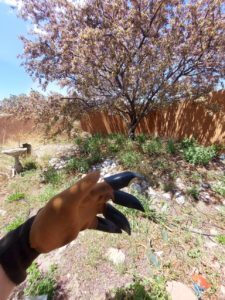 Um, are there gardeners out there who like remember absolutely everything they plant. This is an interesting corollary to the fact that as a writer I consider myself to be a gardener. Um, and I totally don’t remember everything I plant until it grows it pops up. So yesterday as I was clinging things out I found a little bleeding heart and it was already starting to bloom it so I’ll put a photo off that because I know you’re dying to see and then I was like okay where did I plant the other ones and I found one other and right behind me and it’s also about to bloom and. The other one I think is hunted the crab Apple I’m gonna have to go look for it. Um, for a while I did have these markers like these copper markers that you could use a special pen to Mark things on um, it it didn’t last you know the garden doesn’t love. Having things really neatly laid out at least mine doesn’t um, one of my friends in Laramie who was also a writer and was also a gardener. We shared a great deal that way she said that she had read an interesting study on that people with. Really well ordered gardens tend to have have well-ordered gardens because they have more chaotic lives and people with really organized lives have more chaotic gardens um behold my chaotic garden. She always thought that was really funny that I was like I never know where I’ve planted things. And some things don’t come back I mean that’s the thing about Santa Fe um we things just don’t always over winter um rodents dryness sometimes it gets really cold but we had a lot of things over winter this year um so yeah. And the lilacs are starting to bloom. You probably can’t see it very well. But I’ll turn the video in case, you are on video. You could see that the lilacs are starting to pop so that’s cool. Um, so yeah I got that all finished by yesterday afternoon and. Showered off and was enjoying the grape arbor and got a call from my stepsister that my parents were in a car wreck. They’re both okay more or less okay totaled the car this kid going really really fast. Um. They were going through. They’d stopped his stop sign and we’re going through the intersection and my mom keeps calling the kid. We don’t know how old he is but he was going really fast and slammed into them spun them around stepdad had to stay the night in the hospital. Ah, he’s.