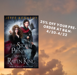 Good morning, everyone! This is Jeffe Kennedy author of fantasy romance and romantic fantasy I’m here with my first cup of coffee. Ah. Had to take an extra sip there today is they haven’t done this for a while say it with me: Friday! Whoo, um April Twenty second so it’s 4 twenty two 22 and it’s beautiful morning here. Crab Apple tree is in glorious bloom and I’m realizing. However. That I need something on my little arms because we’re go have wins again today but today and tomorrow shall be the last for the big wins and then we get nice again? Um, but I’m going to go grab a jacket I shall be right back there I put on a pink. To match the crab Apple but you probably can’t see all that well because of the rising sun but um and I grab my notes because I made notes today. Um I think I haven’t given a writing. Update. And a while I’m still working on The Storm Princess and the Raven King I am well past midpoint I’m closing in on scene 5 and I’m at um, little shy 55000 words I I think it’s going fine. It’s funny because lately ah, several people have asked me how the writing is going which I guess people must ask me all the time and I’m just noticing it lately because I actually don’t have a good answer to it I think my head is so caught up with nebula planning and stuff with SFWA. Yeah, I’m actually not I don’t know I’m I’m not um, what is the word I want people. I want to say kvetching and that’s not right? Um I’m not all caught up in the book I’m not having my usual emotional turmoil over writing this book I feel like I’m circling in the book I thought that after the.