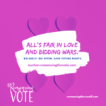 First things first: the Romancing the Vote auction is live! I’m offering six months of author coaching to the winning bidder and the bids are climbing! This is an important cause and tons of great stuff from all kinds of wonderful industry folks. Go forth and bid!