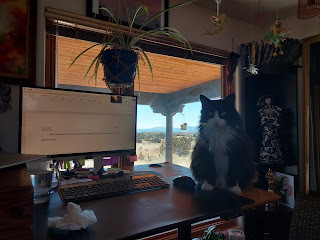 I took this picture today. Jackson visits my writing desk daily, politely sitting to the side of the keyboard (win!) and staring at me until I pet him (not ideal). Observers have accused him of whispering the books into my ear. I will neither confirm nor deny. I can only say that, as a ghostwriter, he works pretty cheap.