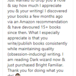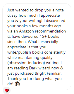 Just wanted to drop you a note & say how much I appreciate you & your writing! I discovered your books a few months ago via an Amazon recommendation & have devoured 15+ books since then. What I especially appreciate is that you write/publish books consistently while maintaining quality (obsession-inducing) writing. I am reading Dark wizard now & just purchased Bright Familiar. Thank you for doing what you do!