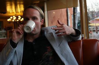 Things should've been clear to me that events would quickly become disastrous when the plane lifted off and was immediately blown around by the wind, and then the tail end of the plane dropped during take-off and a whole gaggle of people screamed and several people, myself included, white-knuckled our arm-rests. When we finally got past all the turbulence, the Stewardess asked me if I was alright and brought me a cup of coffee. I wasn't one of the folks who screamed, but because I sitting next to her in the back of the plane, she must've seen me turn several shades of pale that likely qualified as disturbing. I can turn from tan to sheet-white in a heartbeat. My eyes go black and my hair takes on this Einstein quality and the overall picture is like something from the sketch books of Tim Burton.