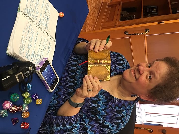 The way this works is that she has created 100 lists of 10 possible story elements. First she rolls the percentile dice to select the page, then she rolls one for the list of ten.