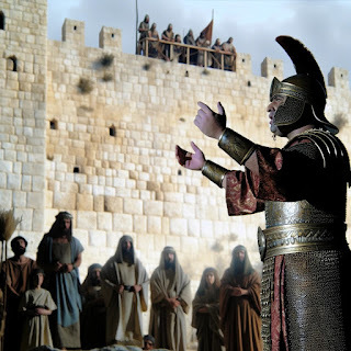 KingSennacherib of Assyria had conquered many lands and took on Jerusalem. Hesent his commander to intimidate Hezekiah by dissing Yahweh. Hesaid this in 2 Chronicles 32 verse 9