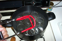I suppose it was inevitable that all of this fresh produce would leave to making Jam. I think that was only part of my interest in the practice. Most of it came from the interest in making bread from scratch. It seemed silly to me to spend time allowing the dough to ferment slowly for enhanced flavor only to slather on some store bought jam that has sugar or high fructose corn syrup as a first ingredient. I'm also planning on making maracons http://en.wikipedia.org/wiki/Macaronfrom scratch. Regular jam wouldn't do. And if I am considering Jam that in the ten buck range, I'd just as soon make my own. I'm not courageous enough to trust that my canning will hold up for months. I'm happy with smaller yields (2 jars per type) that will last in the fridge for a couple of weeks. Once I'm better at it, I'll give jars as gifts. The process isn't difficult, but it is exacting if one wants to avoid dangerous canned goods. I think the biggest challenge for me is that once you begin the sterilizing process, you have to be ready to fill the jars with the hot mixtures. As I've often said, our apartment is small, and the kitchen is miniscule. Making the various jams used every bit of available space and most of my pots and pans. Luckily, the recipes can be re-heated to boiling later on or even the next day (I just don't add the pectin until right before I'm ready to put everything in the jars). I can rest while Jon cleans up the kitchen. Love that Kitchen Aide! Then, I can start the sterile cleaning of the stove and the sink. I even did the floor. I think I was thinking of an operating room. The instructions were adamant about everything touching the jars and lids be extremely clean. It was a mite scary transferring the newly cleaned and rinsed glasses in the hot water pot with the transferring grabber gizmo. I had to make sure that water was filled to the top without falling over. But what was really terrifying was grabbing the sterilized jars, pouring out the hot water and gently setting it on a tray. My long time readers may recall, that I am quite a klutz at times. And I have had incidents with scalding water. Luckily, Everything went well this time. And the jams turned out nicely. The apricot isn't quite as good as the stuff I had in the south of France, but it was tasty with very little sugar. I'm hoping the process will get easier with each attempt.