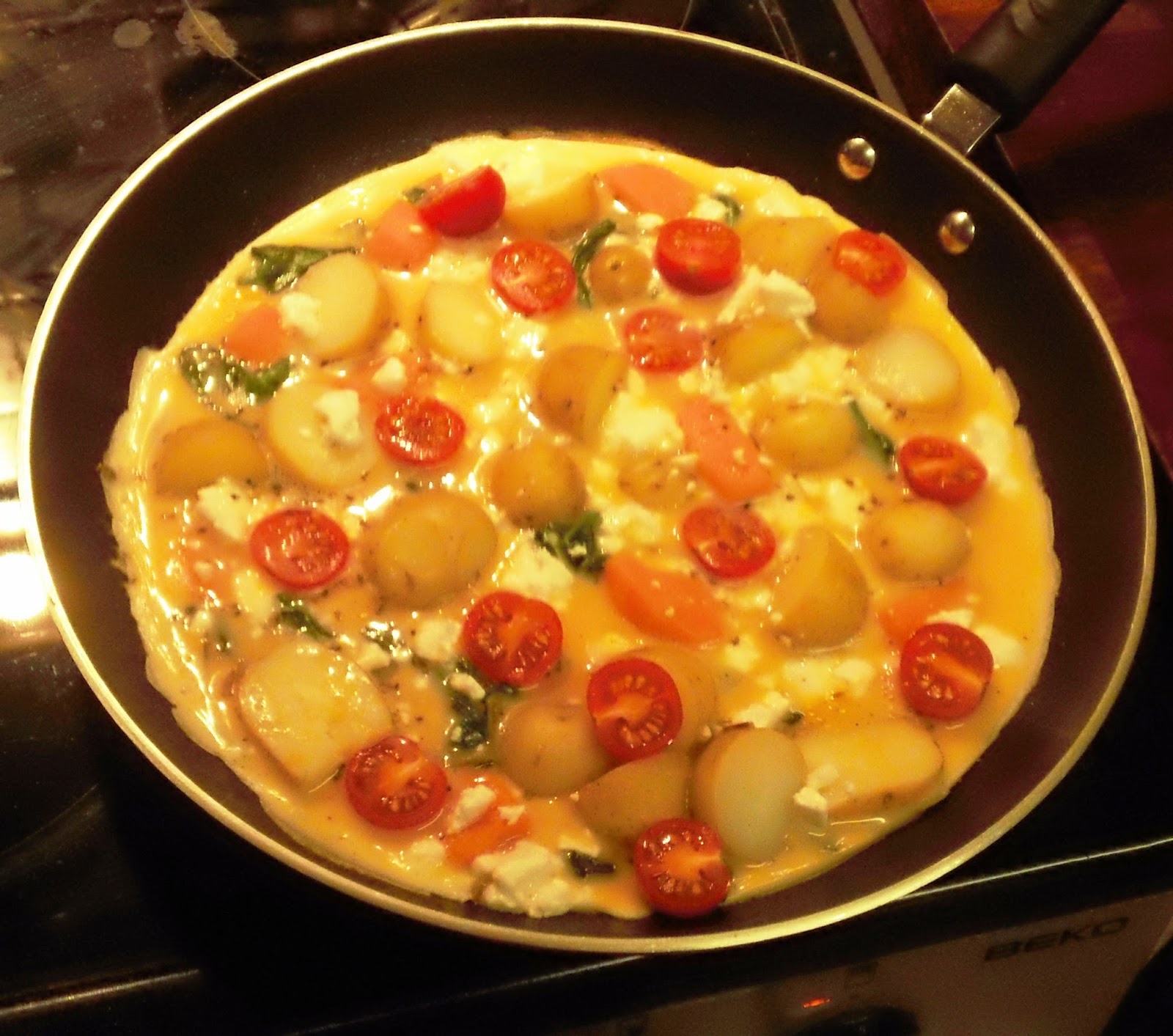 Eg. it's still a little gloopy and jelly-like on top, but a quick shake of the pan shows that the bottom has solidified, throw the cut up tomatoes on the top and then put the frittata under the grill (if your grill is slow to warm up, maybe put it on a few moments beforehand so it has time to warm up).