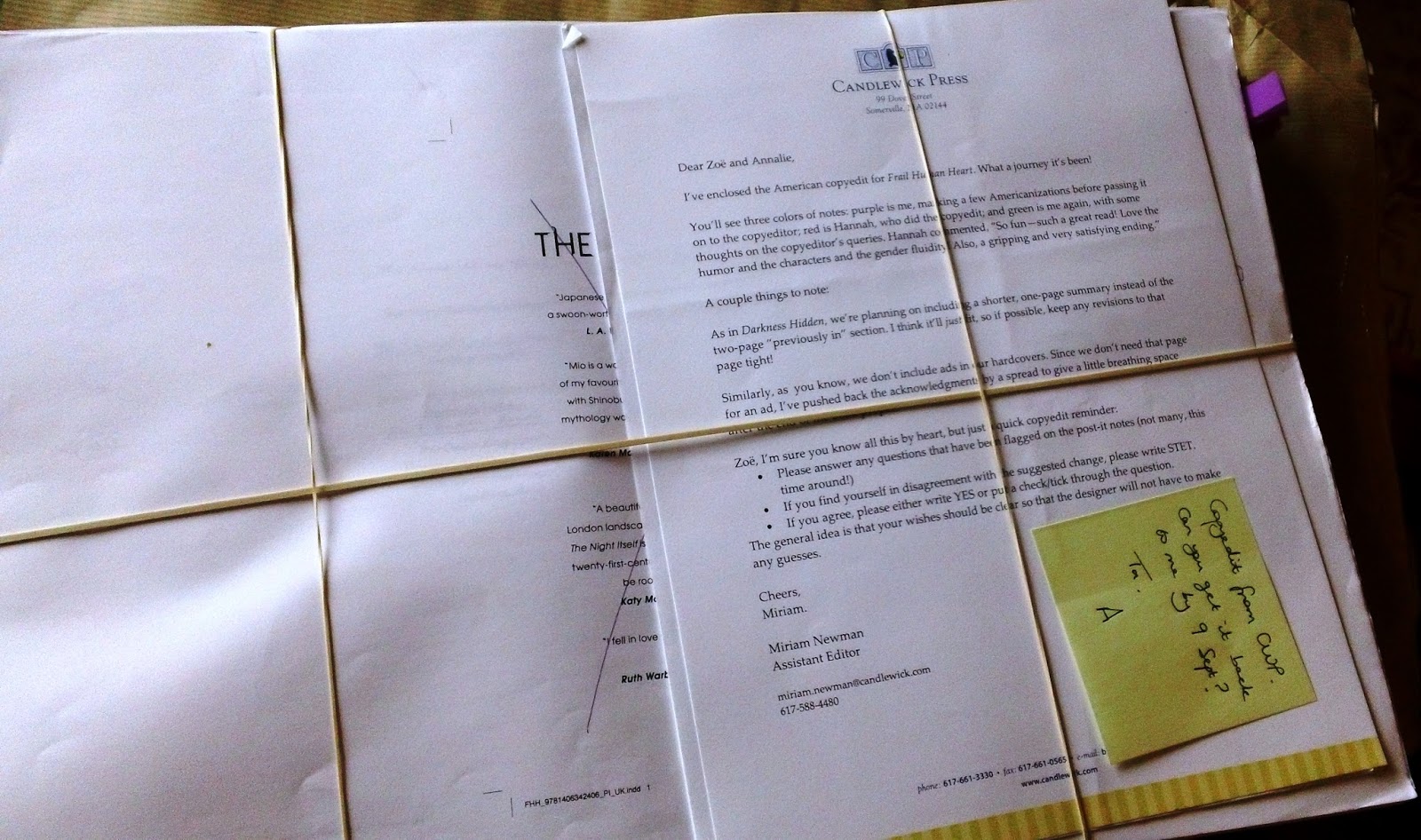 You might be little confused as to why this would make me feel ALL THE EMOTIONS or why I felt the need to snap a picture. But consider. Copyedits/pass pages are literally the last stage that a book goes through before it's sent off to the copyeditor and actually becomes a book. This is the final book of the trilogy. What that means is that this is the last time I will ever do work on or make changes to the trilogy. Ever. When I sealed up that big envelope to send it off to Candlewick Press (or rather, to my editor at Walker so that she could send it to Candlewick Press) I was saying goodbye to The Name of the Blade for the final, final time.