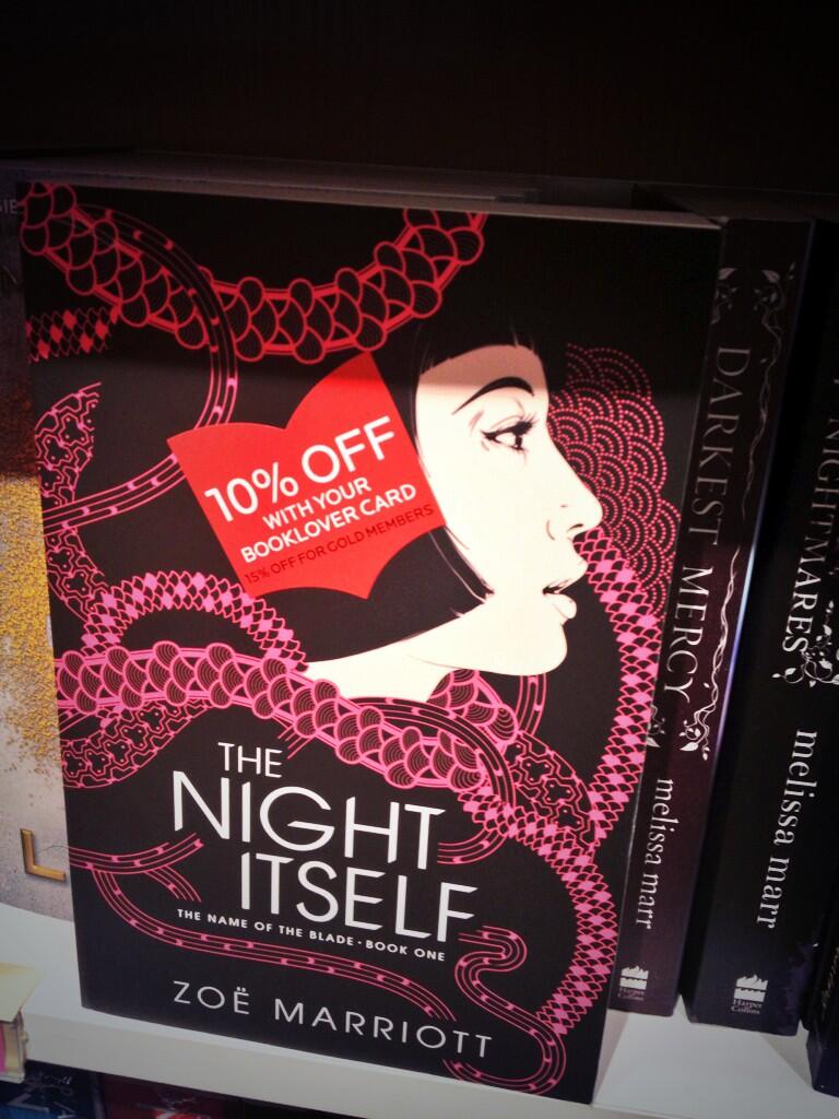 "Next month the fantasy writer Zoe Marriott explodes back on to the scene in THE NIGHT ITSELF, a manga-inspired romance about a half-Japanese girl in London whose grandfather's antique sword turns out to have supernatural powers."Yay! (although Mio is actually British-born-Japanese, not half Japanese). And today the lovely Megan from the U.S. emailed me with a pic of her copy of TNI nestling on her shelf after it arrived yesterday: