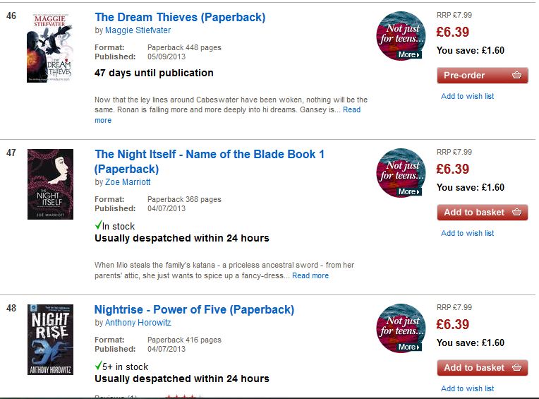 This was in the Kingston branch of Waterstones, and got Rachel excited because she hardly ever sees my books in Waterstones. I hardly ever see them in Waterstones either (or any physical bookshops, really) so it's exciting for me, too. Let's hope someone adopted my hot-pink darling and took her home very shortly after this picture was taken. Sadly over the weekend The Night Itself dropped down from its all-time high ranking of No. 45 in the Waterstone's Not Just For Teens list to the rather less exciting No. 356. But never mind - I'll always have my screencaps. However, if anyone was wanting to cheer me up a bit, and they had any thinky thoughts about TNI to share, you could nip along to Waterstones website, or