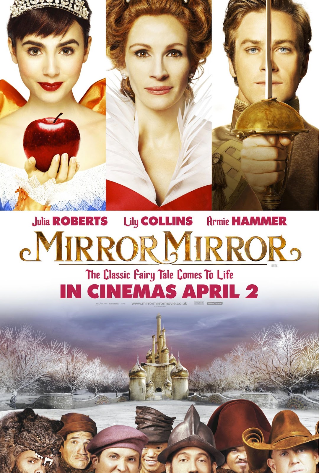 Finally! You may remember that last year I was almost beside myself with excitement about Snow White and the Huntsman, the film which had such a beautiful trailer that it set the internetz on fire and launched a few hundred thousand downloads of 'World Collapsing' the trailer music composed by Danny Cocke. It looked like the sort of story that I would write, and I can't really give a higher compliment than that. But sadly when I went to see it I was disappointed. It was a beautiful but ultimately empty film that offered nothing new in terms of plot or characterisation, and took itself far too seriously. Because of all this kerfuffle however, I completely missed out on Mirror, Mirror, the *other* Snow White film that came out at about the same time, starring Julia Roberts and Lily Collins. I've now finally rectified that.