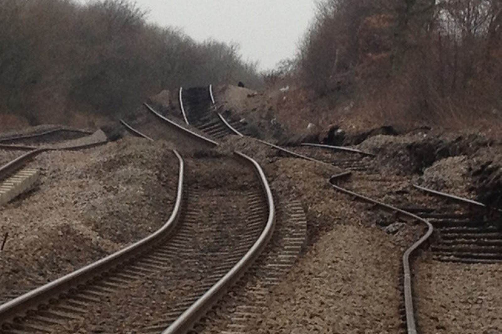 This is what happened to the railway line that I was supposed to be travelling on to get to my meeting. This is a landslip, apparently. Looks like an angry hibernating dragon tried to escape from under the line to me, but what do I know? So I couldn't get on the train that I was scheduled to go on. But apparently trains were running from another town about an hour's drive away. So I gave in and asked my dad to give me a lift there. So far, so good. In your face, travel jinx!