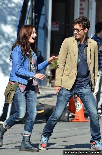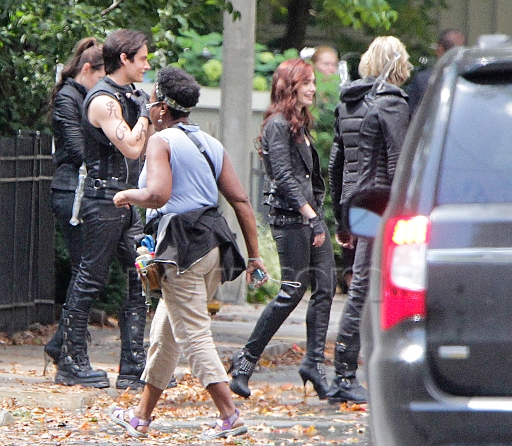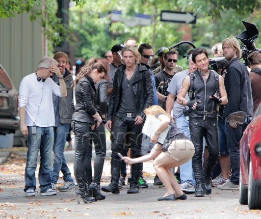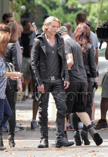 Well, apparently this scene was one where all the Shadowhunters (and Clary) march down the street together and head up to the building that they're using for Clary and Jocelyn's house. A boy (described as 'geeky') bumps into Clary and says 'Wow, Clary you look - uh - different...' Which means that this is the scene where Clary borrows clothes from Isabelle before heading out from the Institute with the gang to see Madame Dorothea at her house. And knowing that? I find this delicious. Because in the book Clary hates having to borrow Isabelle's clothes and feels stupid and awkward in them - but here we, seeing her from the outside, can clearly see that she looks amazing and like a true Shadowhunter (which we suspected from the text). I love it!