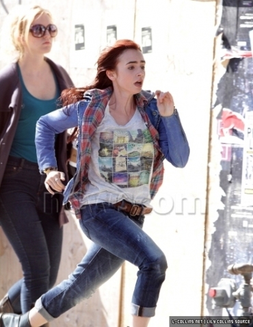 Clary on the phone, rushing down the street with an anxious look on her face. I'm pretty sure this must be the scene where Jocelyn phones her and tells her to stay away from the house, then Clary hears the start of the attack. This made me blink a tiny bit because if I remember rightly, in the book that happens at night and Clary's in club clothes. But it's possible that a) they're going to desaturate the footage to make it look like night and these ARE Clary's clubbing clothes or b) they've rejigged things and the scene doesn't play out that way anymore, which is probably more likely. It's just a little weird to adjust my mental image of that scene, which I always imagined dark and moody, to this sunlit, bright one.