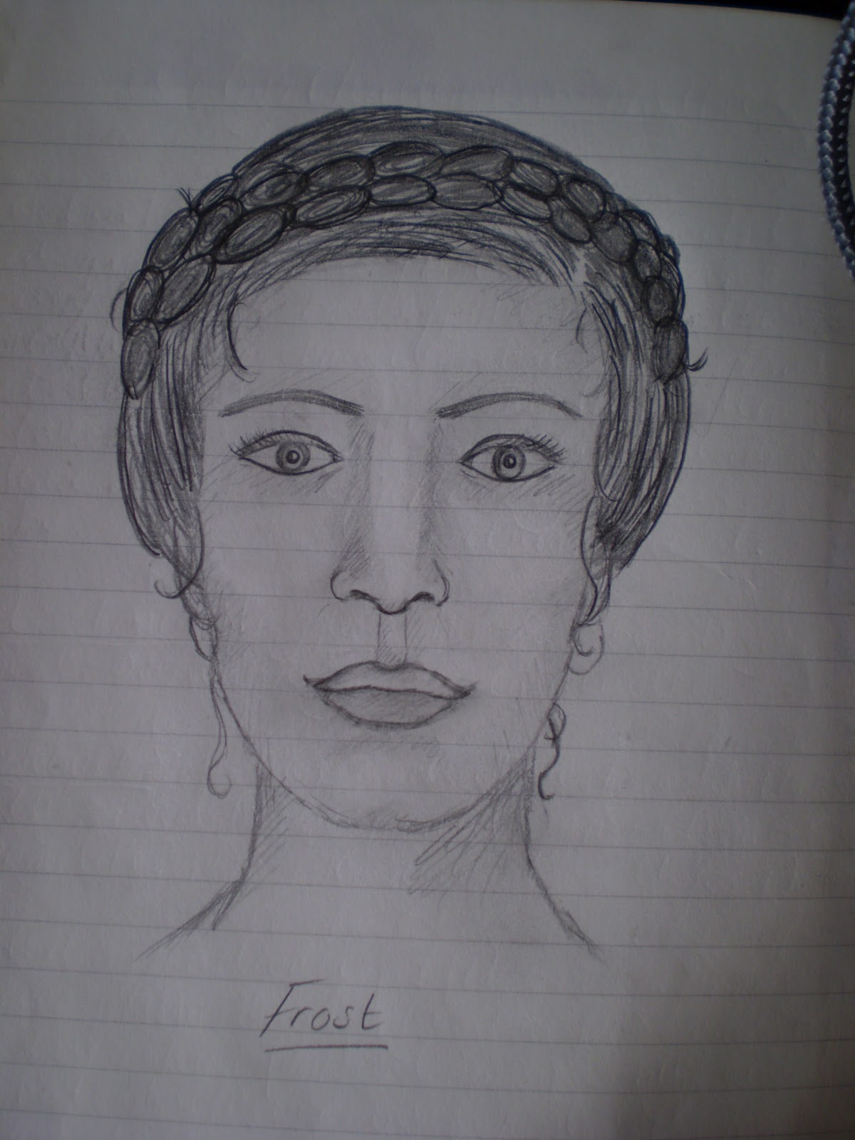 So far, so squeeful. But then, as I mentioned before, we hit a bit of a snag. In the book Frost is described as being tall - as tall as Arian - and very strong and tough. She has dark skin and in my head I've always thought she looked like a younger version of Julia Jones, from the Twilight films, only with long hair. This is the sketch I did of Frost when I was writing the book: