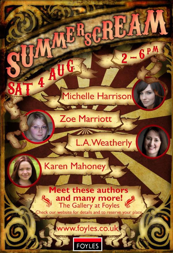 That's an amazing line-up of authors right there - you already know I love Kaz Mahoney and Lee Weatherly (both as luverly people and as writers) because I've interviewed them right here and given away copies of their books. I also know Michelle Harrison from Twitter and she's funny and adorable. We'll be having a panel discussion about books, writing and reading, signing books and (in my case anyway) giving away special presents and swag. I can't tell you how excited I am about this - and I want my Dear Readers there so much, you guys. If any of you can make it you will literally make my day.