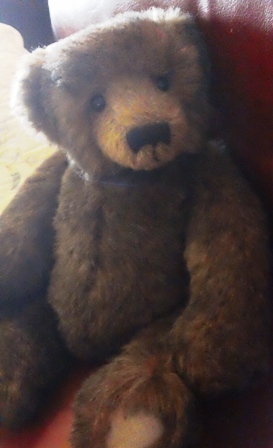 Since I'm taking pics, let me introduce you to a few more members of my bear family. I have many, many bears, but most of them live upstairs and I'm too tired to go up there now (who invented stairs? What an idiot. Let me at him...) so I'll confine myself to the ones who live downstairs for the moment. First of all here's Ellie: