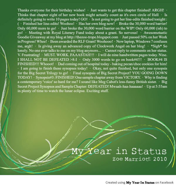 THE EPIC EVENTS OF 2010 January: Found out that I had won the 2009 Sasakawa Prize for Shadows on the Moon. I also found out that my job was under threat.February: Started work on FrostFire (which was then called 'Wolves in the Wind', eugh).March: Went to London and met with my editor, Annalie, and her boss, Gill, as well as lots of other splendid Walker Books people. Realised that everyone was really exited about Shadows and got rather excited myself. Talked about FF with my editor. Convinced her that the protagonist of FF should change to a girl, and got tentative approval of some contraversial details...April: Lost my job. Wanted to crawl into a hole and die. Gill and Annalie rallied around with encouragement and advice.May: Applied for a grant from The Royal Literary Fund on Gill's advice. Also applied for benefits for the first time in my life and thought that I would die of embarrassment because I used to WORK in that office, and everyone knew who I was. Hadn't had so many fingers pointed or so many people whispering about me behind their hands since school.June: Started this blog! And my own YouTube Channel. Applied for every job I could find and frantically scribbled away on FF, achieving a target of 2000 words a day, six days a week, for six weeks.July: Interviewed for several jobs, then found out that I was being awarded an amazingly generous grant from the RLF, and that they intended to pay off all my debts. Realised that I would now be able to be a full-time writer for the next TWO YEARS and went into a state of utter, incoherant bliss for about a week. Came up with brilliant idea of trying to turn FF into a two book series. August: Finished first draft of FF. Gave myself two weeks off and read approximately thirty books, discovering Kelley Armstrong, Holly Black, Sarah Rees Brennan and Cassandra Clare. Was gently persuaded by editor that FF would not work as a two book series and got back to work on it.September: Parted ways with former agent, with much sadness and regret. Went to London to present Shadows on the Moon at the Walker sales conference and was blown away by everyone's enthusiasm for the book. Found a new agent and melted with relief.October: Revealed the cover of Shadows on the Moon and was delighted to find that everyone else loved it just as much as me. Finished another draft of FF. Completed copy-edits of Shadows.November: Realised that the current version of FF was utter, complete, wretched nonsense. Wailed, ripped out hair, banged head on desk, then finally threw it out and started again from scratch. Went to London once more and met awesome bloggers at Walker Undercover event. Was snowed in for a full week and realised snow is only pretty when it's not melting in your boots.December: Finished the penultimate draft of FF. Wrote sample chapter and synopses for Big Secret Project and sent them off to agent. Survived Christmas.