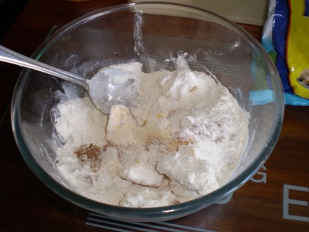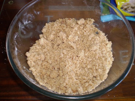 When you've done that, make the crumble topping. Put all the dry ingredients except the oats into a bowl and then rub the flour and sugar into the butter until you have a mixture with the approximate texture of breadcrumbs. But don't be too careful about it.