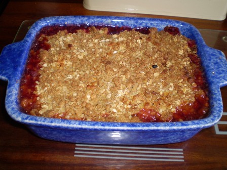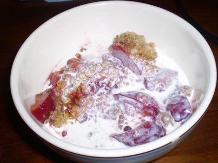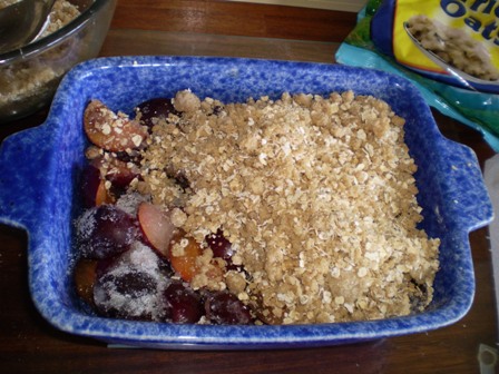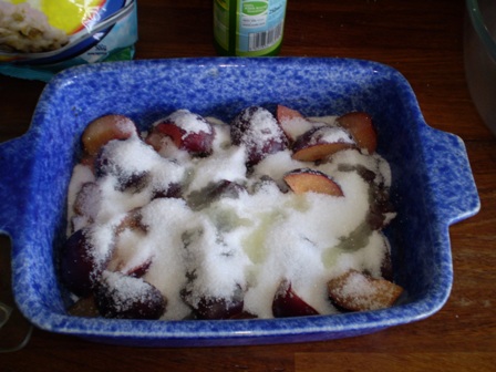 Finally, put the crumple into the oven at about 180C (I've just checked and this would be 360F or Gas 4). If you have a fan oven you won't need to preheat it, but otherwise it's a good idea to put the oven on to warm up about ten minutes before the crumble is ready to go in. Leave it for about forty minutes, or until you can see that the topping has noticeably changed colour and become golden, and that the plum juice (which will be a deep purple colour) has started bubbling up around the edges.