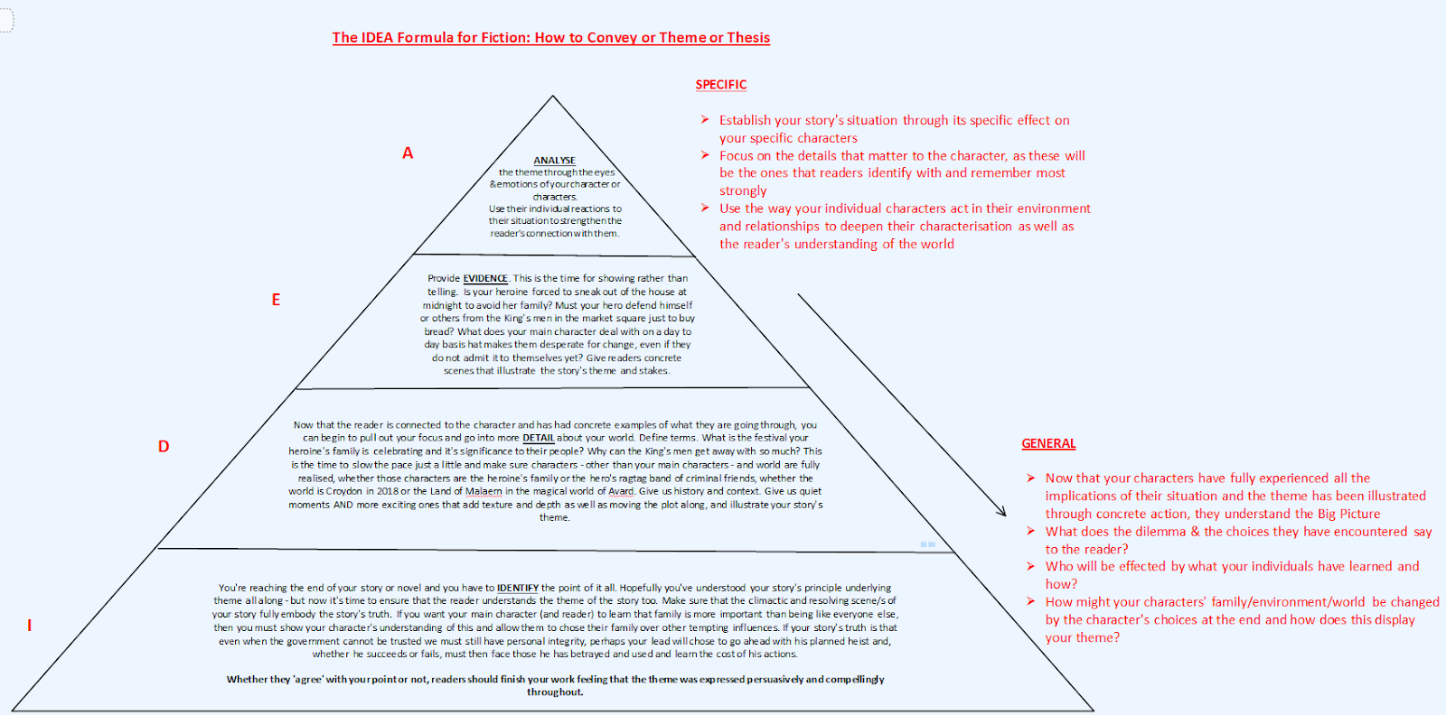 Clicky clicky!I'm not 100% happy with this at the moment, if I'm honest - the descriptions in each part of the triangle don't really get at what I mean the way I want them to. But I still think this could be very useful, especially for people writing short fiction, where your theme is more or less everything, so I decided to share it anyway. I might be back with a tweaked version in the next couple of weeks!What do you think of the IDEA triangle, muffins? Useful? Sound off in the comments :)