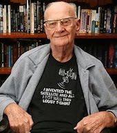 Arthur C. Clarke was 90 when he died in 2008. His shirt reads: "I invented the satellite and all I got was this lousy t-shirt" In the 1980s Clarke became well known to many for his television programs Arthur C. Clarke's Mysterious World, Arthur C. Clarke's World of Strange Powers, and Arthur C. Clarke's Mysterious Universe. The popularity of those shows was influential on both writers and scientists around the world as he urged both to “look at the impossible and then find ways to make it possible. The limits of the possible can only be defined by going beyond them into the impossible.”