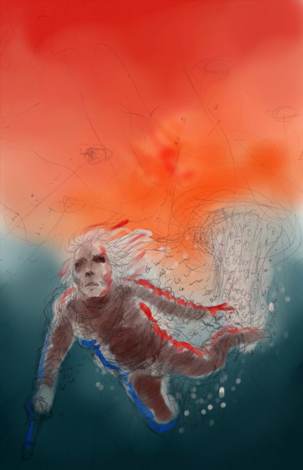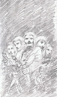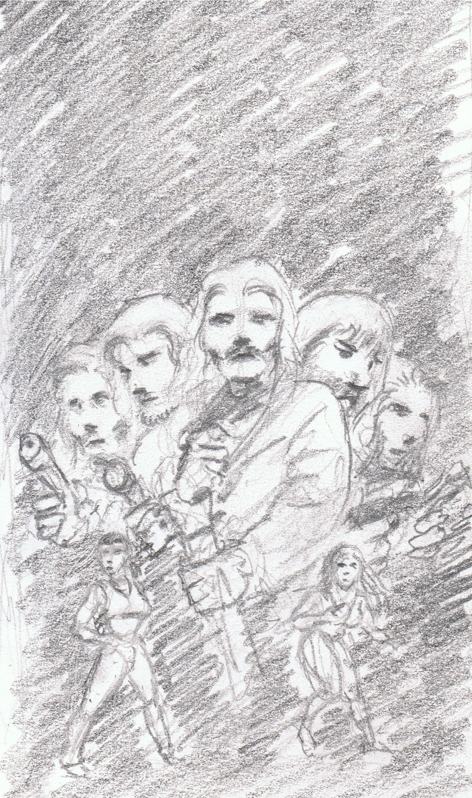 Although I quite liked the image of Matthias Gantlet diving into the water with an awesome explosion going off above (and may ask M.D. to use it in the future), I thought that the assembled band members shown in the first sketch might be most like the cover of a rock album and fit the title of The Gantlet Brothers Greatest Hits best, and suggested that the female figures at the bottom be stricken, and that M.D. concentrate on the Gantlet Brothers.