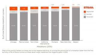 Through its data collected from its users, Strava reports that only 13 percent of marathoners in recent years have actually run negative splits. Strava’s analysis of six marathons reveals that only 3.6 percent of Strava athletes who ran the New York City Marathon and 6.3 percent of those who ran the Boston Marathon completed the second half of a race faster than the first half.