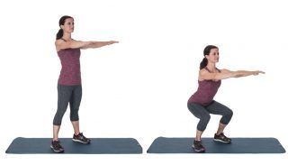 Stand with your feet shoulder-width apart and your heels firmly planted on the floor. Put your hands straight out in front of you and begin lowering your body into a sitting position. Keep your back straight and push your weight into your heels as you reach a sitting position. Hold for three seconds before returning to a standing position. For an additional challenge, perform this exercise with a 10–15-pound dumbbell in each hand and keep your arms down by your side instead of putting them out in front of you.