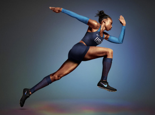in there too – after all, that’s our flag’s colors!” (In this photo, sprinter Allyson Felix wearing a Nike Vapor track and field kit with Nike AeroSwift technology and Nike Zoom Superfly Flyknit spikes.) Photo: Courtesy of Nike