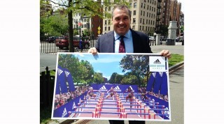 Meet director Mark Wetmore holds an artist's rendering of the track which will be used for the first adidas Boost Games to be held in Boston. Photo: Chris Lotsbom/Race Results Weekly
