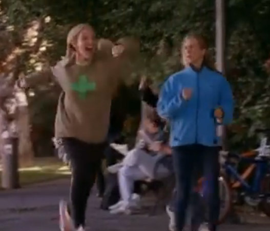 One of the storylines of a 1999 episode involved Rachel not wanting to run with Phoebe because her running form was so bizarre (Rachel says “she looks like a cross between Kermit the Frog and the Six Million Dollar Man.”) Eventually Rachel adopts the form herself after Phoebe insists that it’s much more fun, prompting Phoebe to say “And you don’t care if people are staring, it’s just for a second cuz then you’re gone!”