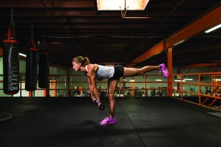 Hold a 10- to 20-pound dumbbell in both hands. Stand straight with your right knee slightly bent. Lower the dumbbells to the floor, keeping your arms straight, and be sure that your back is locked as your left leg kicks back. Keep your head up and aim to maintain a straight line between your left shoulder and your left leg. When the dumbbells get close to the floor, pull your arms up away from the floor and return to a standing position. Repeat this sequence 10 times, then switch and do the same on your left leg.