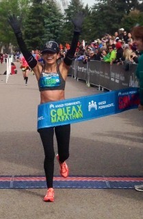 Heidi Lozano breaks the tape at the Colfax Marathon on Sunday, winning the overall title at age 53. Photo: Colfax Marathon Facebook Page