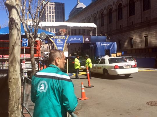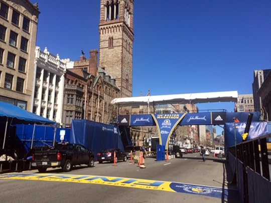 The finish line has been set up for a few days, even though Boylston Street is still open to traffic.