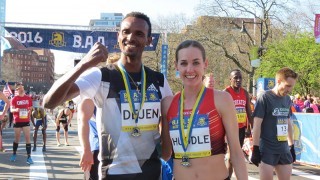 Men's winner Dejan Gebremeskel (left) and women's winner Molly Huddle at the B.A.A. 5K. Photo: Jane Monti for Race Results Weekly