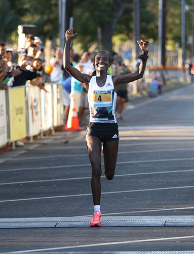 The elite division, called “The Chase,” pitted elite runners against the best local runners from Hawaii in a handicapped format. The winner of that race was Isabella Ochichi of Kenya.