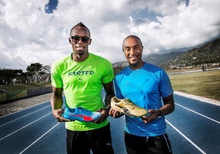 Sprint king Usain Bolt (left) and Colin Jackson, the 1993 world champion in the 110-meter high hurdles, show off the new and old version of Puma's competition spikes with Disc dial lacing technology.